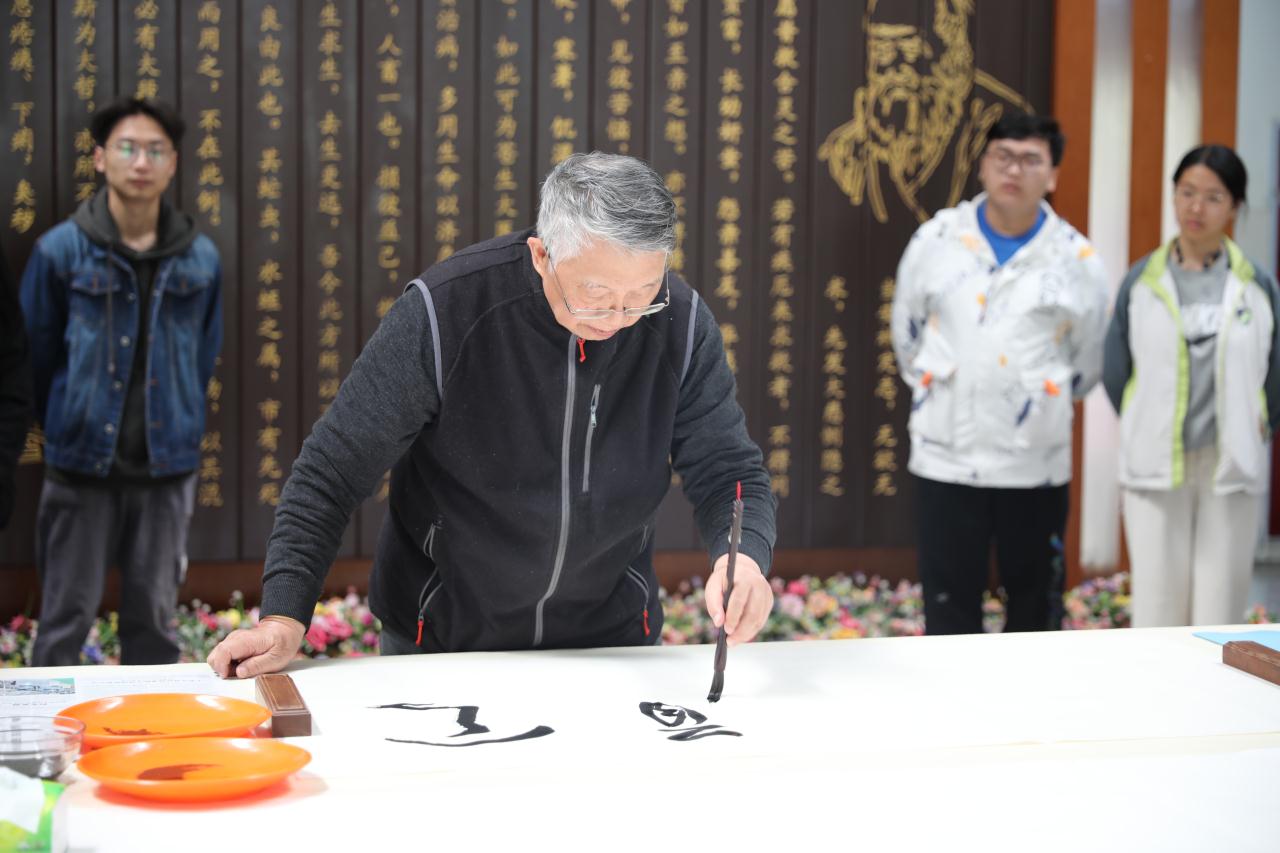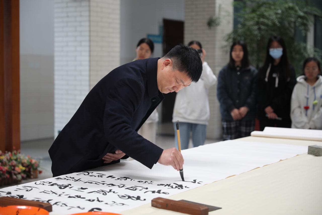 叶怀祥分别以左手、右手、嘴巴、左脚、右脚现场创作书法作品,展现了他高超的书法水平。汪涌泉和两名学生代表也上台挥毫泼墨,展现我校书法艺术风采。