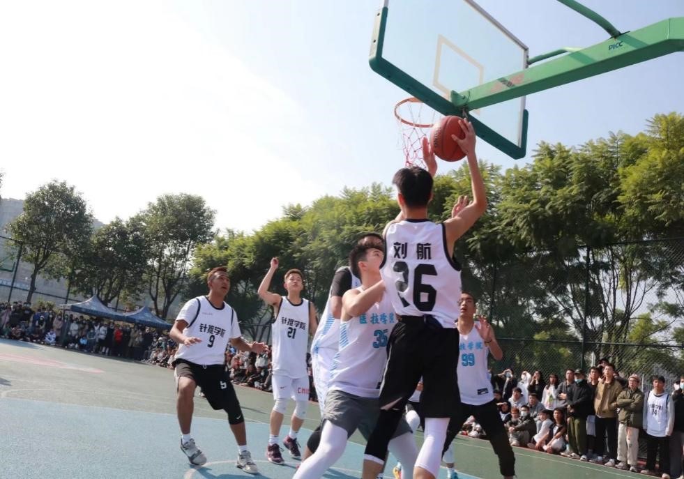 在这近两周的比赛中,篮球健儿们过五关斩六将,他们战胜自己,战胜对手,在篮球比赛现场,每天都有大量同学观看,为他们加油打气。选手们在阳光下奔跑、在球场上挥洒汗水、他们一攻一防,博出精彩。篮球赛场上,哨声响起的那一刻,现场气氛急剧攀升,双方队员很快进入了激烈的追逐,队员们动作娴熟,球技精湛,在投篮或是运球过程中都是行云流水,英姿飒爽。