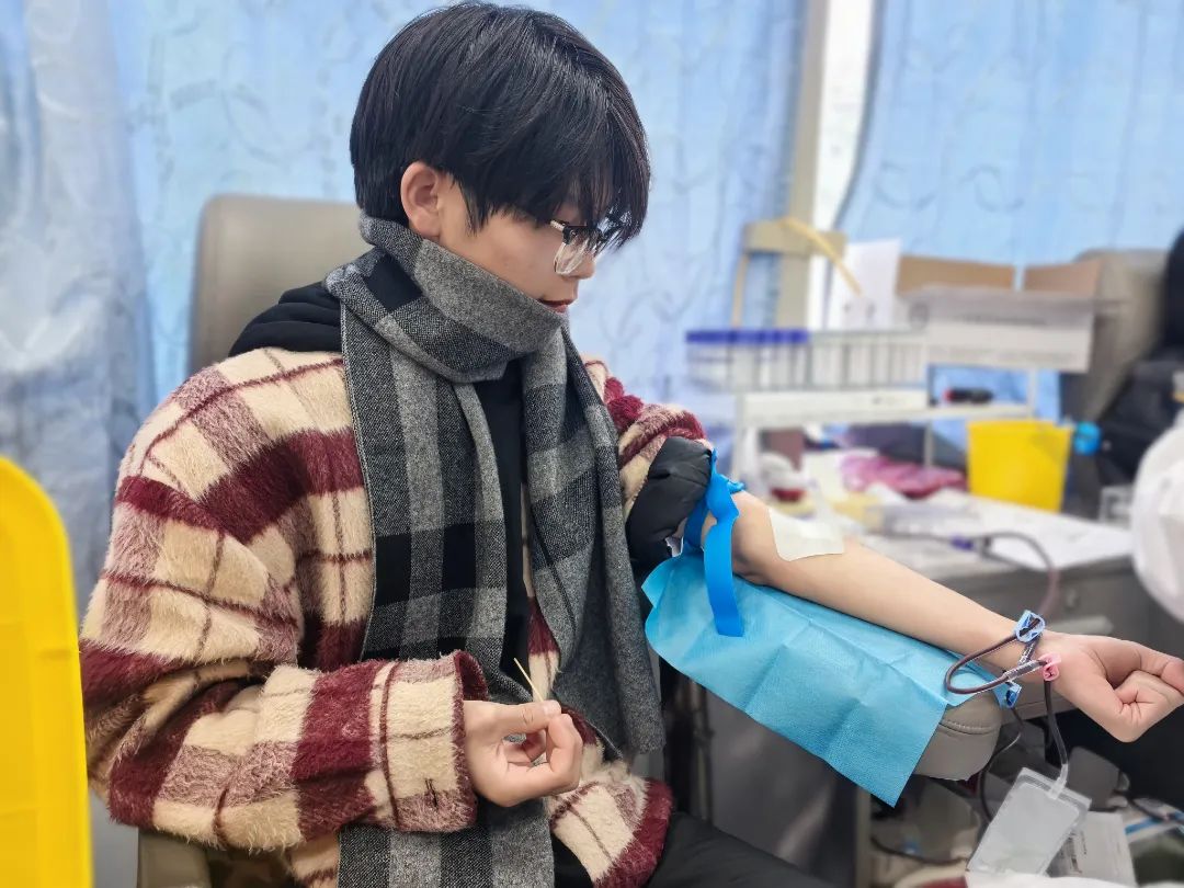 在学校道路旁的张贴栏里张贴着无偿献血宣传海报;穿着红马甲的志愿者发放着无偿献血宣传资料,为同学们科普一袋血的意义。该校均为医学生,他们早早践行“医者仁心”的精神,即使天气寒冷,依然来献血车旁登记,帮助需要用血的患者。浓浓的爱心在传递,簇拥着等待献血的人群吸引着更多的同学和老师驻足停留,越来越多的师生加入到献血活动中。