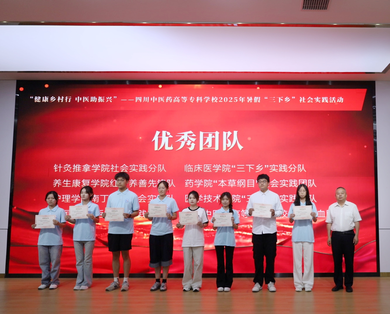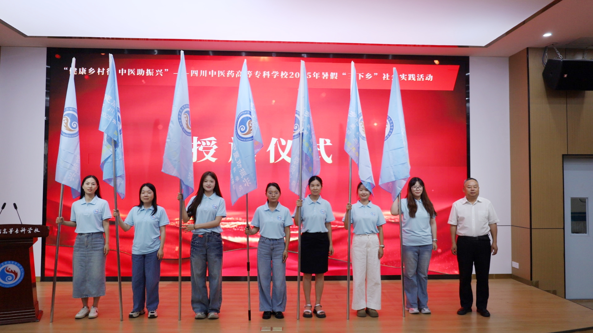 出征仪式上,校团委书记王尹佚宣读了《关于表扬2024-2025学年社会实践活动先进集体和个人的通知》,对优秀团队、优秀指导教师和先进个人进行颁奖。随后,校党委副书记商碧辉为各实践分队代表授旗,标志着团队成员们正式踏上服务基层、服务乡村的新征程。在庄重的宣誓仪式上,志愿者们将牢记“德馨 博学 创新 奉献”的校训,竭尽全力、不负重托,以实际行动发扬“奉献、友爱、互助、进步”的志愿者精神和“团结奋斗,追求卓越”的四川中医高专精神,为助力乡村振兴、推进“健康四川”建设贡献力量!