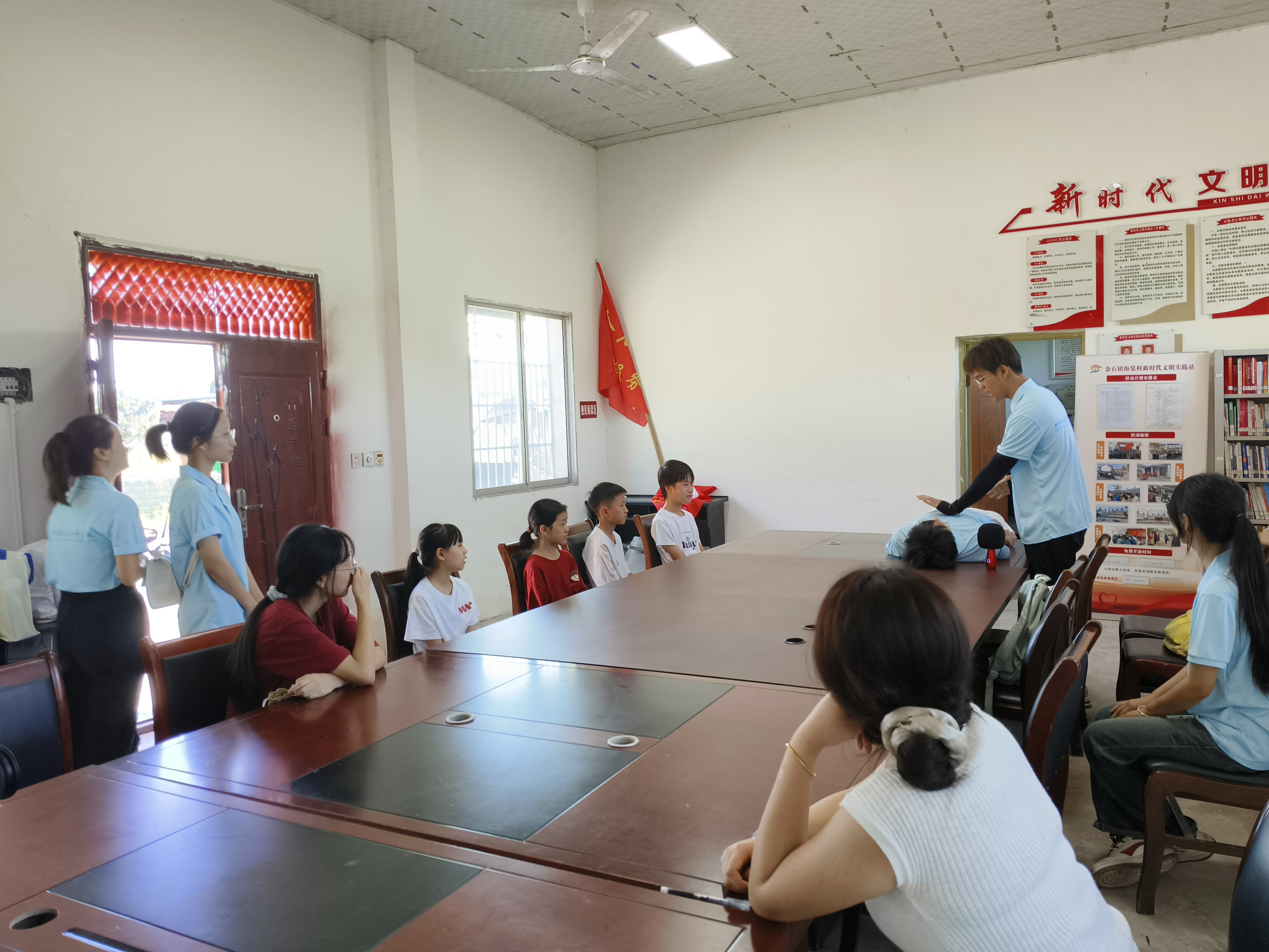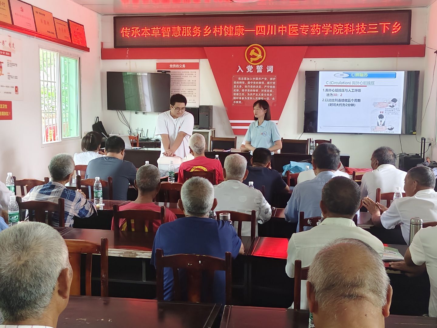 6月30日,针灸推拿学院、临床医学院和医学技术学院师生组成的实践分队率先迈出实践步伐,奔赴三台县金石镇海棠村,为“健康乡村行 中医助振兴”拉开温情序章。医学文化宣讲抛开专业术语,用身边鲜活案例,把高深医学智慧化作家常科普语,助村民轻松探知医学奥秘;健康宣教环节则聚焦于常见疾病的预防,从日常饮食的合理搭配、营养均衡,到日常生活中的防护要点、习惯养成,为村民们精心编织起一张全方位、无死角的健康防护网,为他们的身体健康保驾护航。急救技能教学现场,队员们们手把手耐心传授心肺复苏和海姆立克急救法,每一个动作、每一个细节都讲解得清晰透彻,让村民们切实掌握“救命招”。留守儿童团辅巧用中医互动游戏,传递知识与温暖,让健康意识在村落悄然流淌。