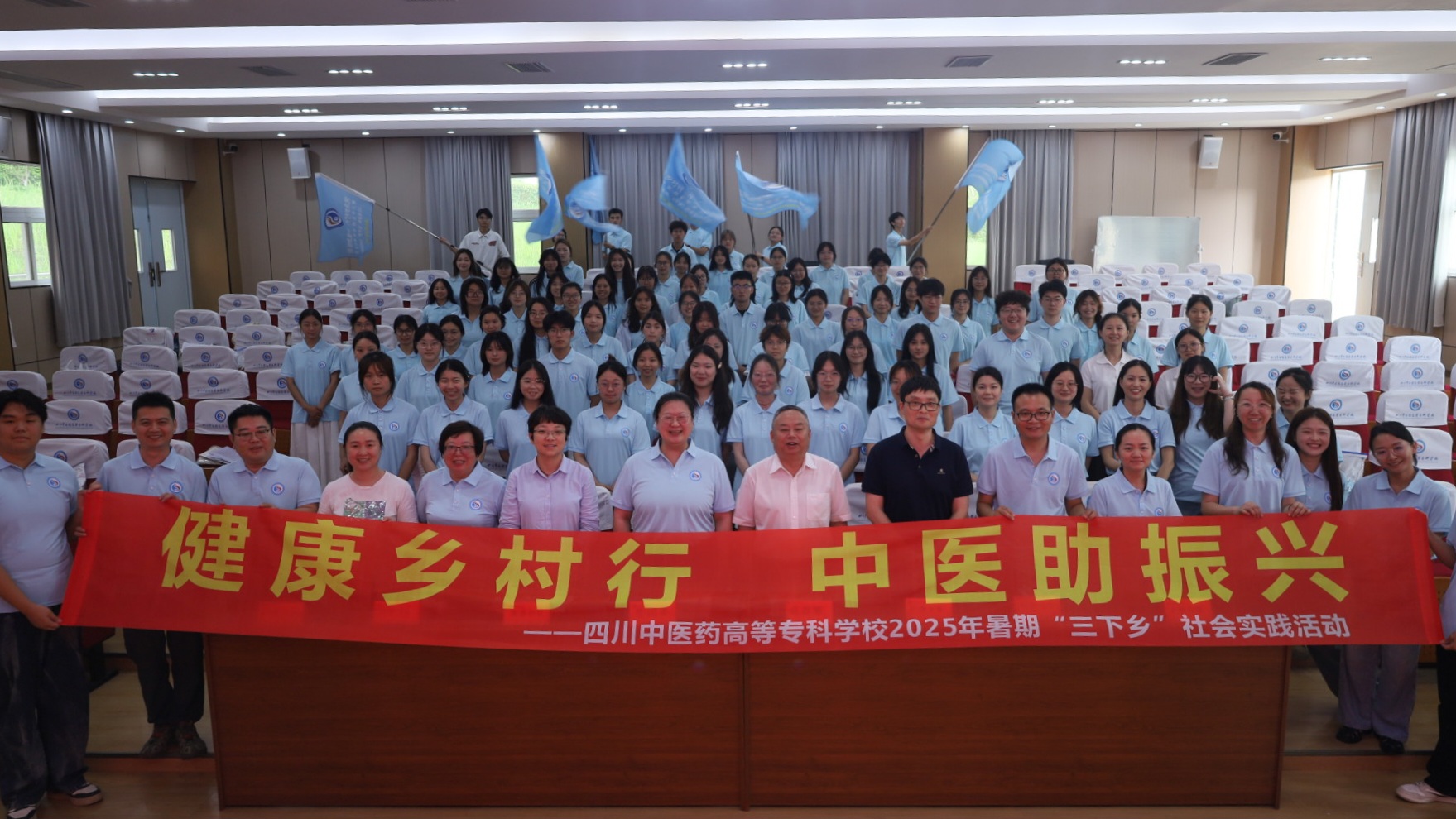 6月26日,四川中医药高等专科学校举行2025年“健康乡村行 中医助振兴”暑期“三下乡”社会实践团出征仪式,仪式上,学校党委副书记商碧辉为各实践分队代表授旗,标志着团队成员们正式踏上服务基层、服务乡村的新征程。